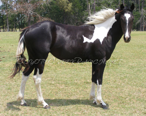Chico's Wildfire is HOMOZYGOUS FOR BLACK AND TOBIANO. She is a half sister to Jr World Champion, Waynes Spirit of Texas. Wildfire has the size and ability to show in pleasure or cattle event... click for more
