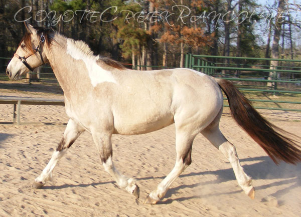 In pedigree: Buckeye colonel(16.1 hand BL/WH double homozygous tobiano. Carries Cremello/Dilution gene) Barrel Horses in pedigree.